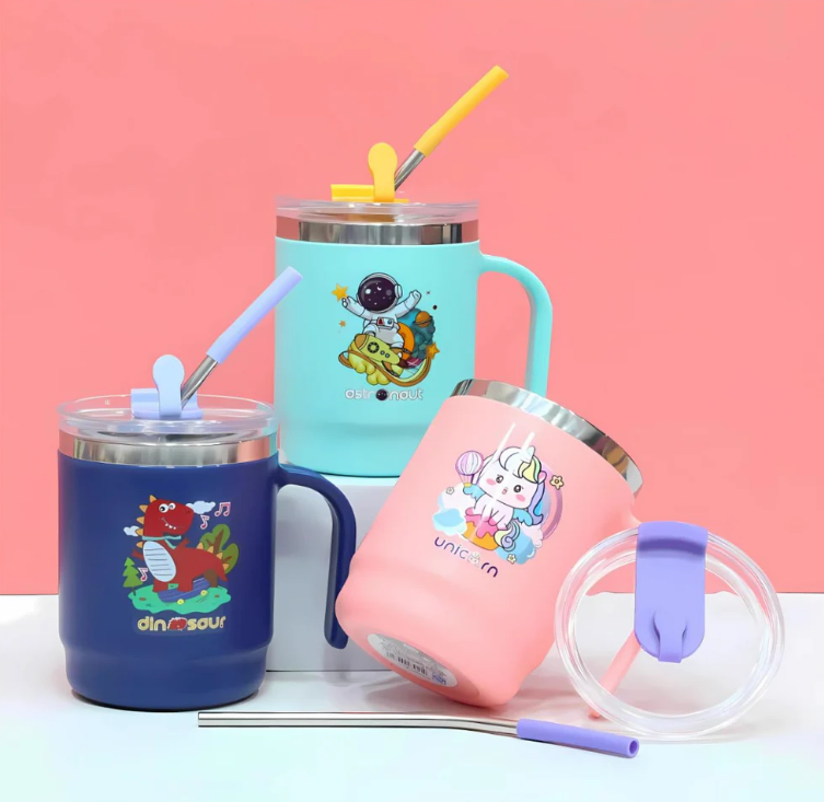 400ml Stainless Steel Insulated Handle Mug With Straw Small Tumblers for Kids Children with Cartoon Characters for Kids
