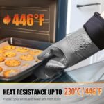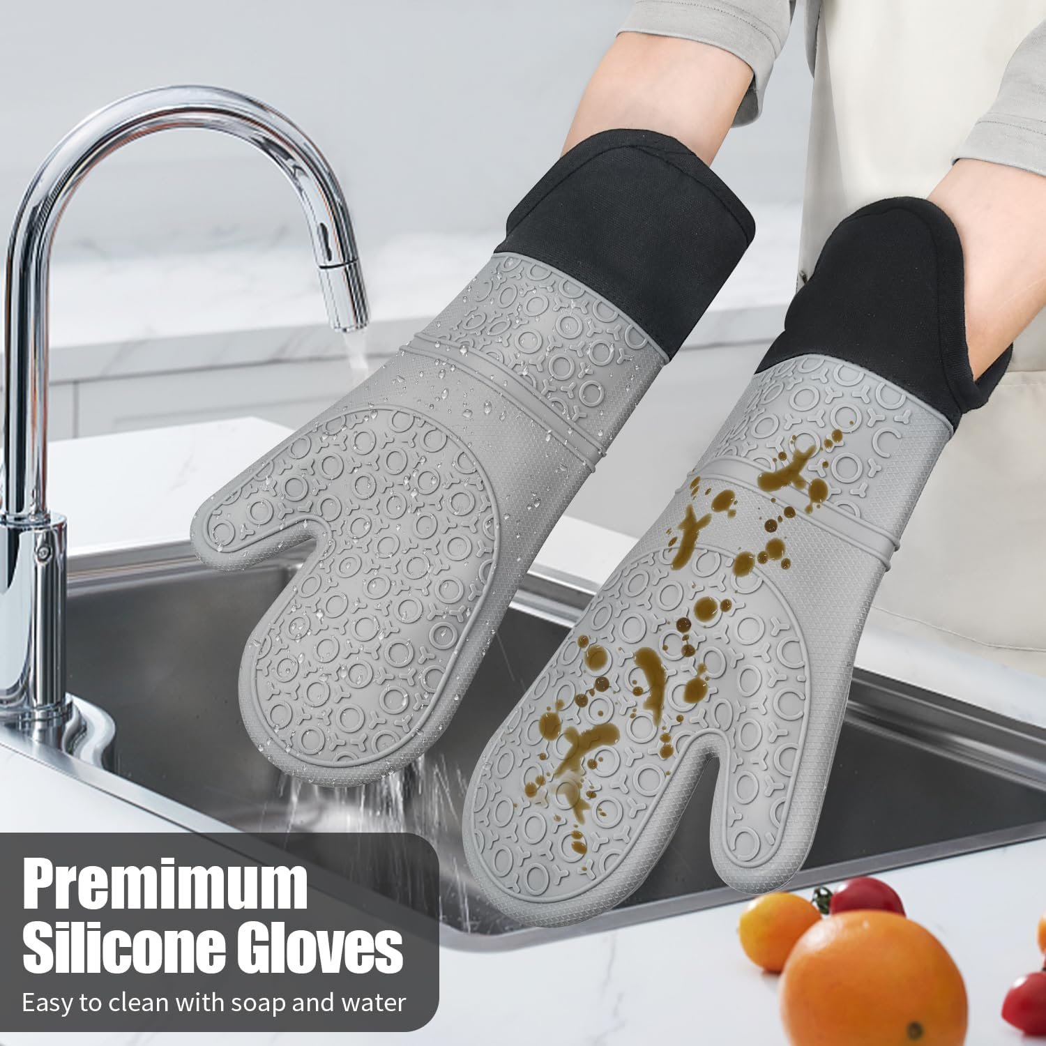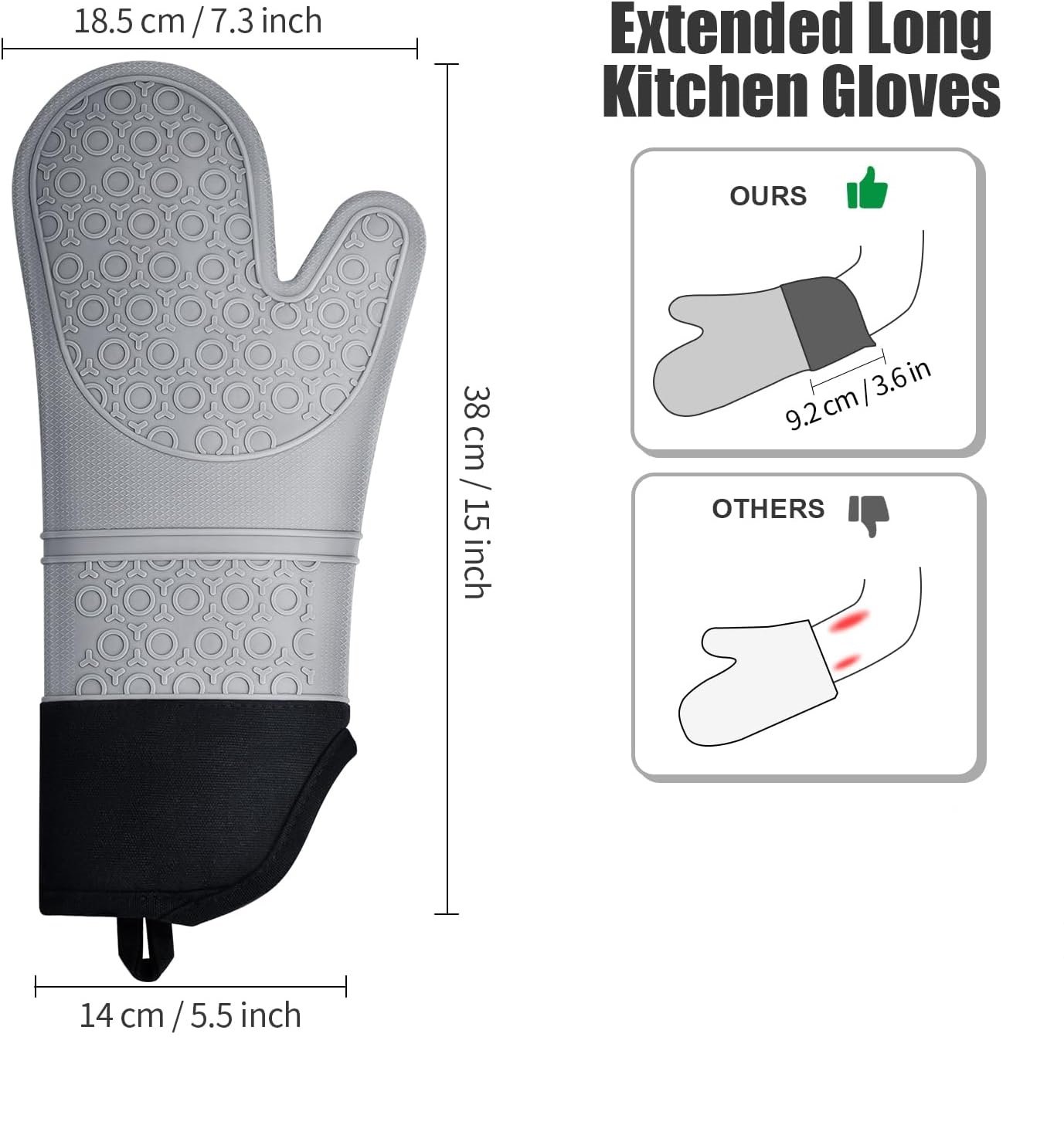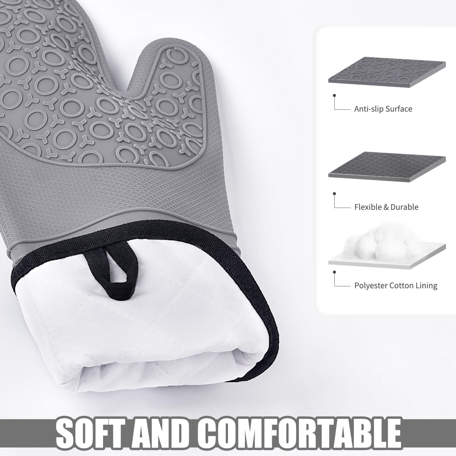 Silicone Oven Gloves Heat Resistant: Our silicone oven gloves are made of high-quality food-grade silicone with a breathable quilted cotton lining. These gloves are designed to withstand high temperatures up to 230°C/446°F, making them superior to cloth gloves when it comes to handling steam or hot items from the oven. Their long sleeve provide excellent protection for your wrists and lower arms.
